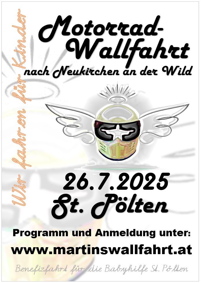 08.30 Uhr – Aufstellung der Motorräder auf dem Schotterparkplatz der Pfarrkirche St. Pölten – Maria Lourdes (neben dem Universitätsklinikum St. Pölten) – Weitere Informationen, Ablauf und Anmeldung finden Sie auf der Homepage www.martinswallfahrt.at.